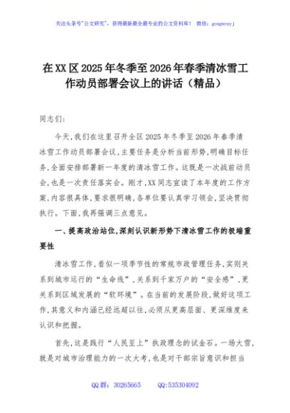 / 在XX区2025年冬季至2026年春季清冰雪工作动员部署会议上的讲话(精品)