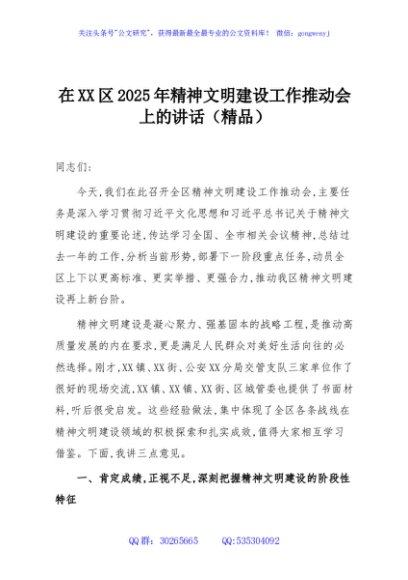 / 在XX区2025年精神文明建设工作推动会上的讲话(精品)