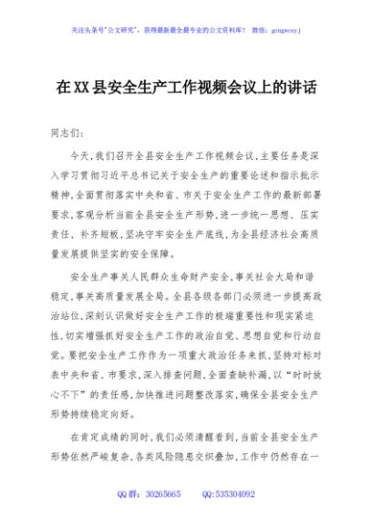 / 在XX县安全生产工作视频会议上的讲话