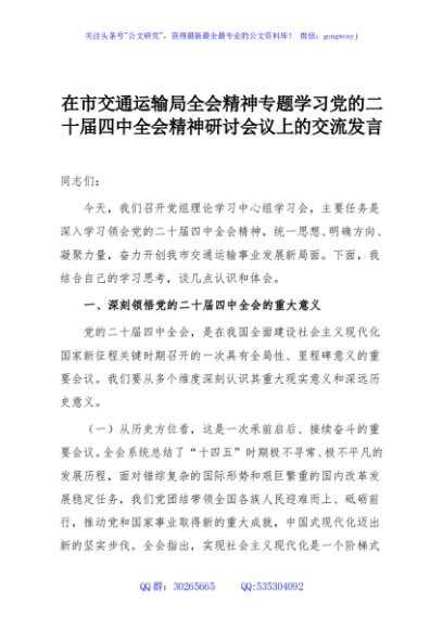 / 在市交通运输局全会精神专题学习党的二十届四中全会精神研讨会议上的交流发言