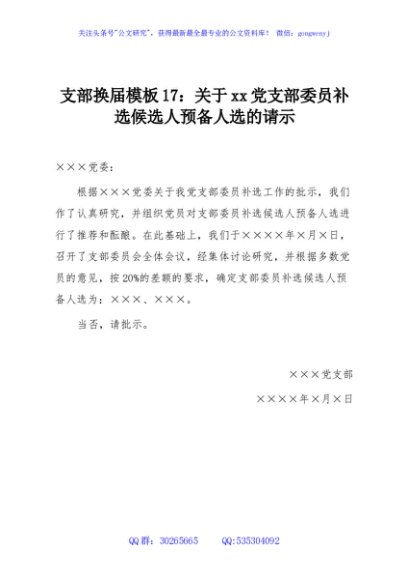 / 支部换届模板17:关于xx党支部委员补选候选人预备人选的请示