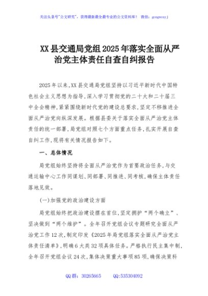 / XX县交通局党组2025年落实全面从严治党主体责任自查自纠报告