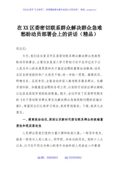 / 在XX区委密切联系群众解决群众急难愁盼动员部署会上的讲话(精品)