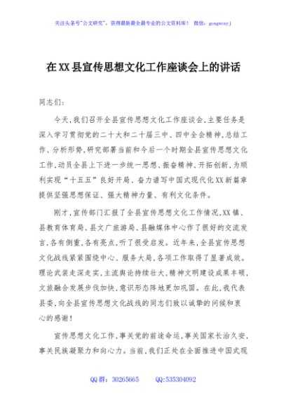 / 在XX县宣传思想文化工作座谈会上的讲话