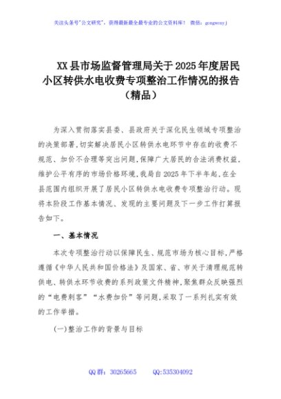 / XX县市场监督管理局关于2025年度居民小区转供水电收费专项整治工作情况的报告(精品)