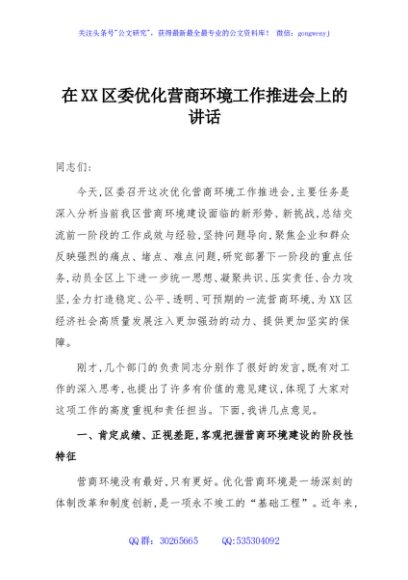 / 在XX区委优化营商环境工作推进会上的讲话
