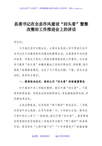 / 县委书记在全县作风建设“回头看”暨整改整治工作推进会上的讲话