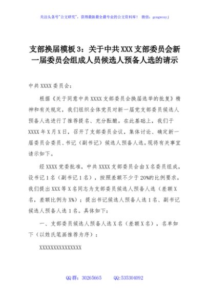 / 支部换届模板3:关于中共XXX支部委员会新一届委员会组成人员候选人预备人选的请示