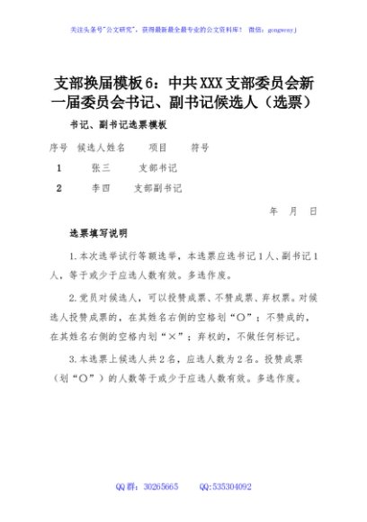 / 支部换届模板6:中共XXX支部委员会新一届委员会书记、副书记候选人(选票)