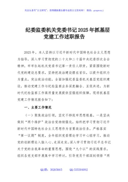 / 纪委监委机关党委书记2025年抓基层党建工作述职报告