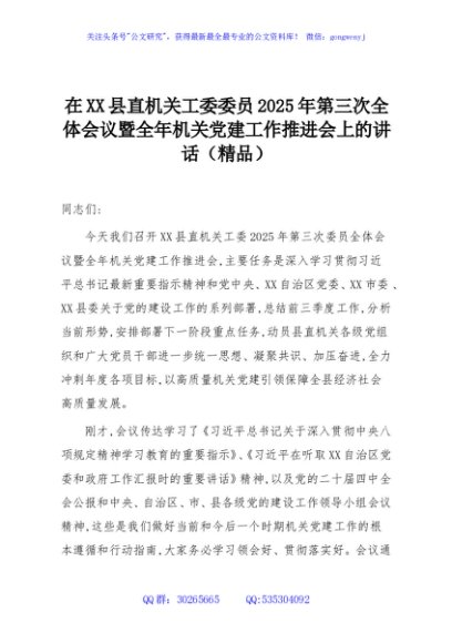 / 在XX县直机关工委委员2025年第三次全体会议暨全年机关党建工作推进会上的讲话(精品)