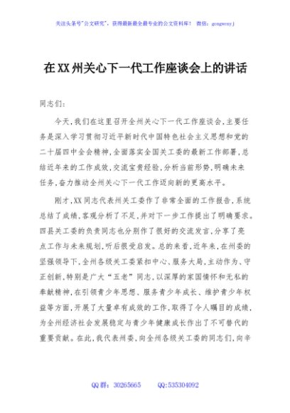 / 在XX州关心下一代工作座谈会上的讲话