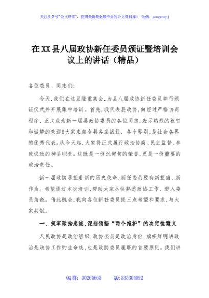 / 在XX县八届政协新任委员颁证暨培训会议上的讲话(精品)