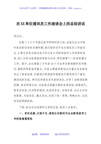 / 在XX单位通讯员工作座谈会上的总结讲话