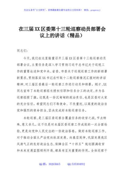 / 在三届XX区委第十三轮巡察动员部署会议上的讲话(精品)