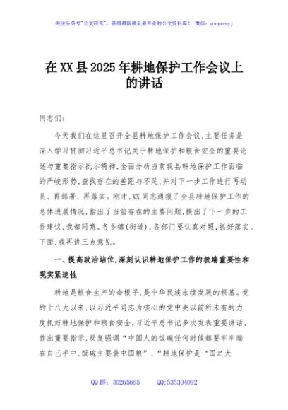 / 在XX县2025年耕地保护工作会议上的讲话