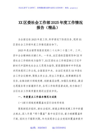 / XX区委社会工作部2025年度工作情况报告(精品)