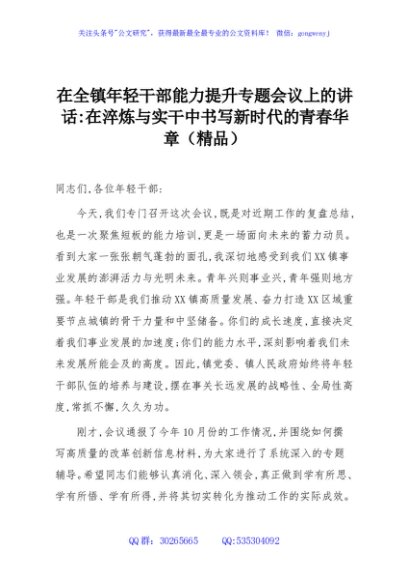 / 在全镇年轻干部能力提升专题会议上的讲话:在淬炼与实干中书写新时代的青春华章(精品)