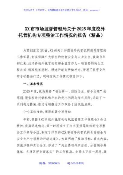 / XX市市场监督管理局关于2025年度校外托管机构专项整治工作情况的报告(精品)