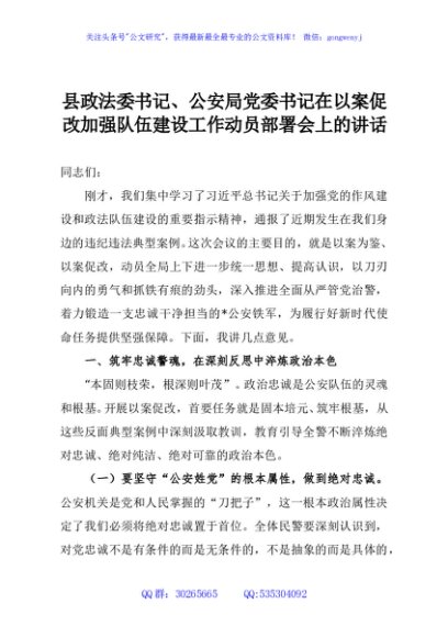 / 县政法委书记、公安局党委书记在以案促改加强队伍建设工作动员部署会上的讲话