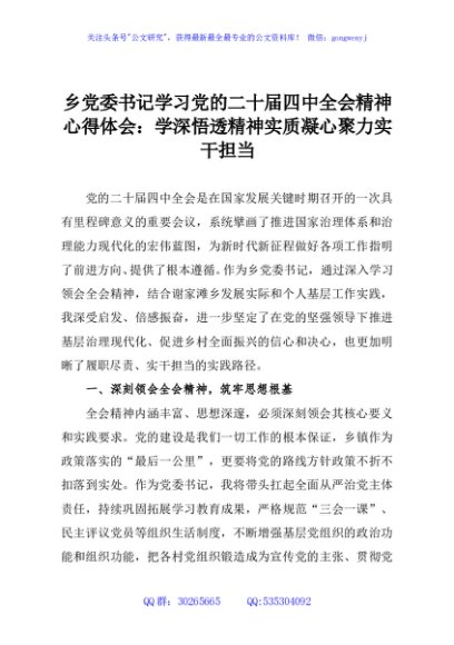 乡党委书记学习党的二十届四中全会精神心得体会:学深悟透精神实质凝心聚力实干担当