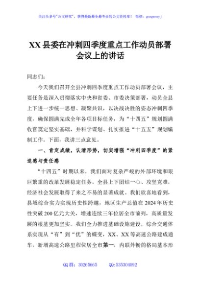 / XX县委在冲刺四季度重点工作动员部署会议上的讲话