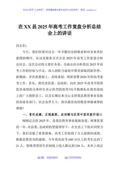 / 在XX县2025年高考工作复盘分析总结会上的讲话