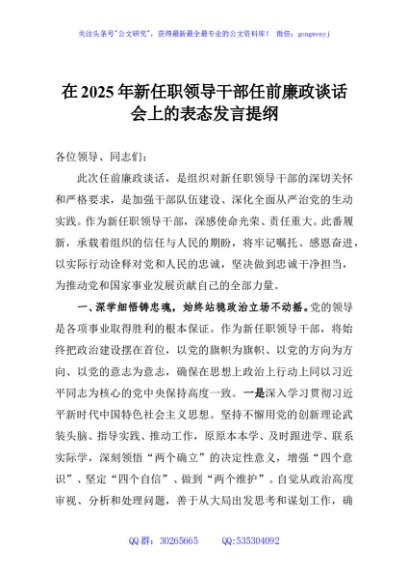 / 在2025年新任职领导干部任前廉政谈话会上的表态发言提纲