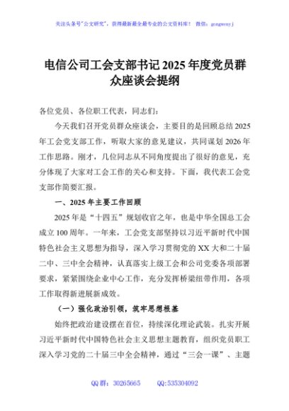 / 电信公司工会支部书记2025年度党员群众座谈会提纲