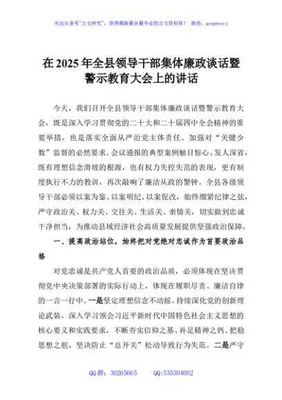 / 在2025年全县领导干部集体廉政谈话暨警示教育大会上的讲话
