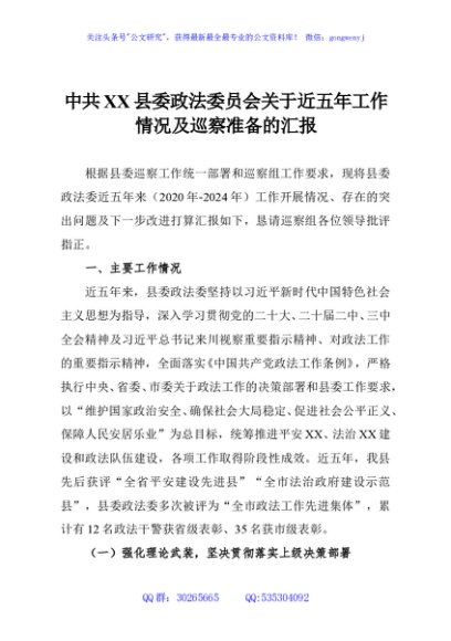 / 中共XX县委政法委员会关于近五年工作情况及巡察准备的汇报