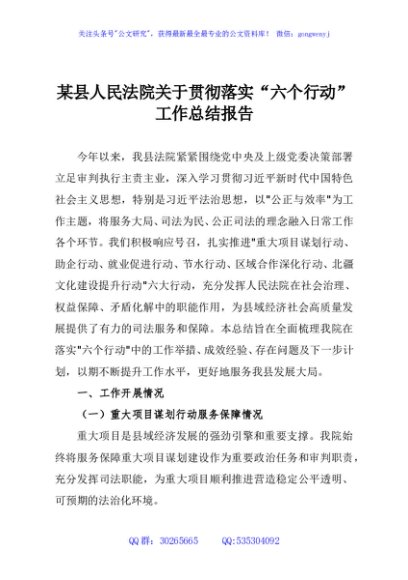 某县人民法院关于贯彻落实“六个行动”工作总结报告