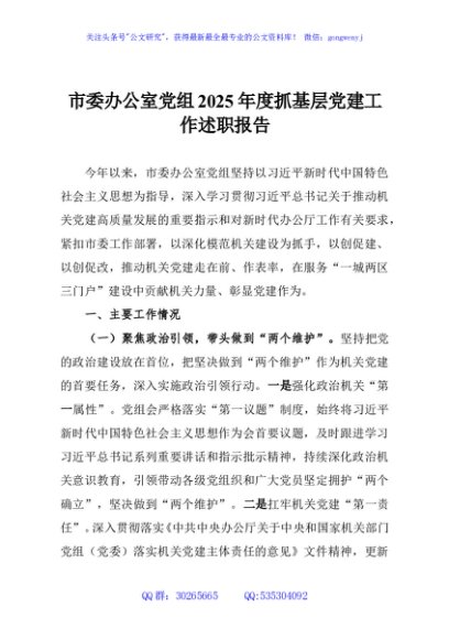 / 市委办公室党组2025年度抓基层党建工作述职报告