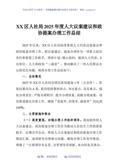 / XX区人社局2025年度人大议案建议和政协提案办理工作总结