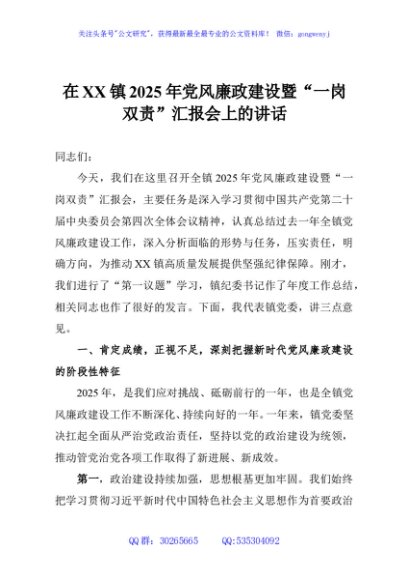 / 在XX镇2025年党风廉政建设暨“一岗双责”汇报会上的讲话