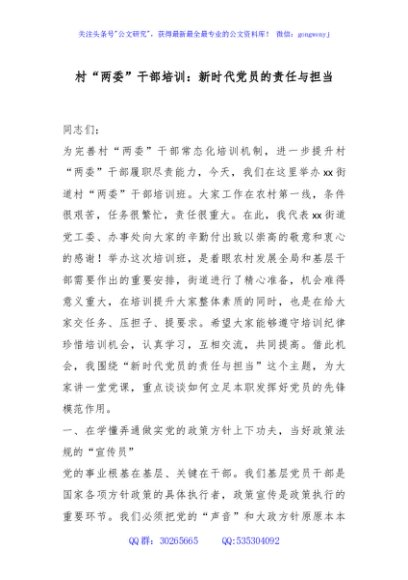 / 讲稿+PPT:村“两委”干部培训:新时代党员的责任与担当--讲稿