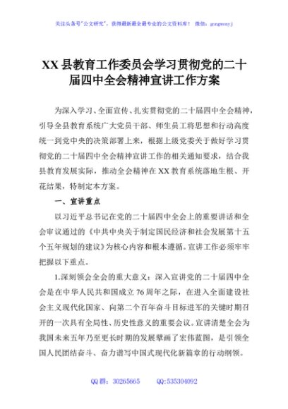 / XX县教育工作委员会学习贯彻党的二十届四中全会精神宣讲工作方案