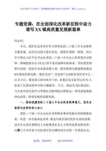/ 专题党课:在全面深化改革新征程中奋力谱写XX镇高质量发展新篇章