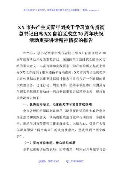 / XX市共产主义青年团关于学习宣传贯彻总书记出席XX自治区成立70周年庆祝活动重要讲话精神情况的报告