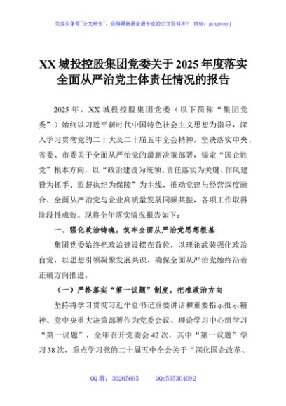 / XX城投控股集团党委关于2025年度落实全面从严治党主体责任情况的报告