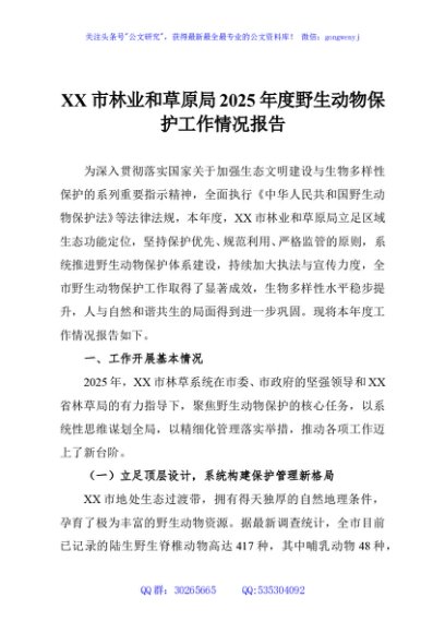 / XX市林业和草原局2025年度野生动物保护工作情况报告