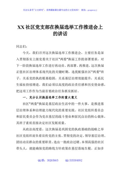 / XX社区党支部在换届选举工作推进会上的讲话