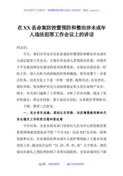 / 在XX县命案防控暨预防和整治涉未成年人违法犯罪工作会议上的讲话