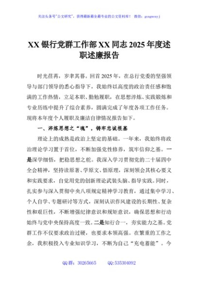 / XX银行党群工作部XX同志2025年度述职述廉报告