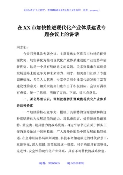 / 在XX市加快推进现代化产业体系建设专题会议上的讲话