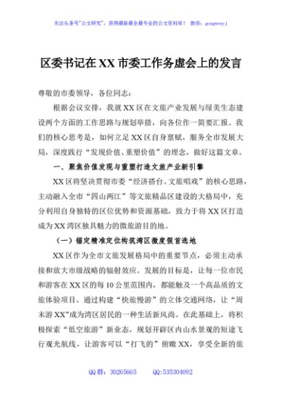 / 区委书记在XX市委工作务虚会上的发言