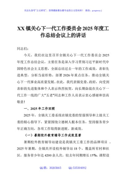/ XX镇关心下一代工作委员会2025年度工作总结会议上的讲话