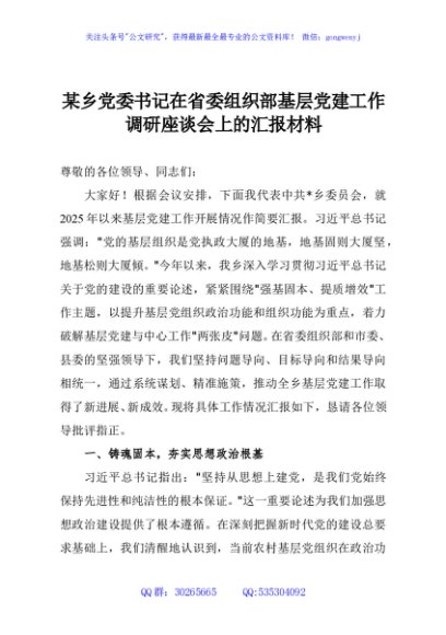 / 某乡党委书记在省委组织部基层党建工作调研座谈会上的汇报材料