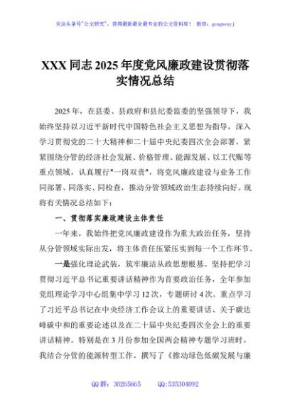 / XXX同志2025年度党风廉政建设贯彻落实情况总结