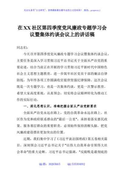 / 在XX社区第四季度党风廉政专题学习会议暨集体约谈会议上的讲话稿